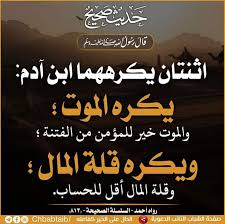 ثنتان يكرههما ابنُ آدمَ : يكرهُ الموتَ، و الموتُ خيرٌ له من الفتنةِ، و يكرهُ قلَّةَ المالِ، و قِلَّةُ المالِ أقلُّ للحسابِ