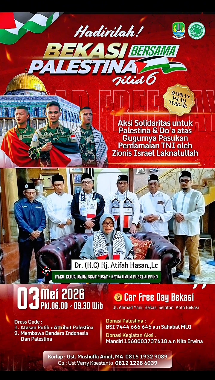 BEKASI (voa-islam.com) – Semangat solidaritas kemanusiaan dan ukhuwah Islamiyah kembali membara di Kota Patriot. Tokoh muslimah sekaligus Wakil Ketua Umum BKMT Pusat, Ustadzah Dr. (H.C) Hj. Atifah Hasan, Lc., secara resmi menyatakan dukungannya dan mengajak seluruh lapisan masyarakat untuk menyukseskan aksi "Bekasi Bersama Palestina Jilid 6".