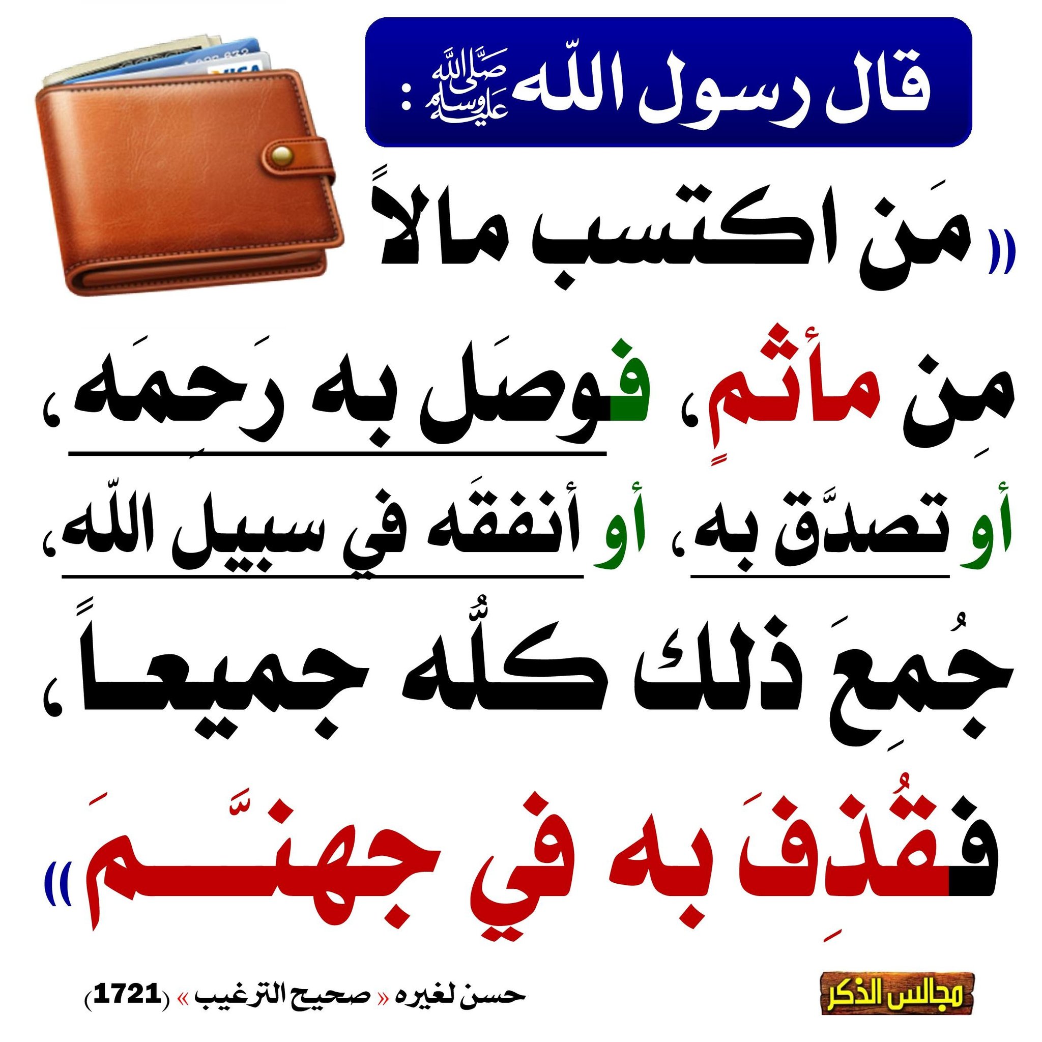 مَنِ اكْتَسَبَ مَالًا مِنْ مَأْثَمٍ، فَوَصَلَ بِهِ رَحِمَهُ، أَوْ تَصَدَّقَ بِهِ، أَوْ أَنْفَقَهُ فِي سَبِيلِ اللهِ، جُمِعَ ذٰلِكَ كُلُّهُ جَمِيعًا، فَقُذِفَ بِهِ فِي جَهَنَّمَ