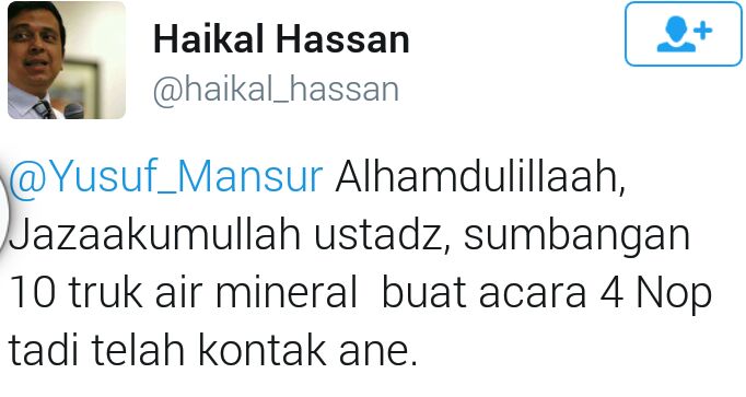 JAKARTA (voa-islam.com) - Ustadz Haikal Hasan menyampaikan bahwa Ustadz Yusuf Mansyur akan menyumbang 1 juta botol air mineral atau sekitar 10 truk untuk acara 'Aksi Bela Islam II' di Istana Negara, Jumat (4/11/2016).