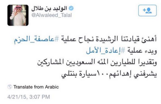 "Saya mengucapkan selamat kepada para pemimpin yang bijaksana atas kemenangan 'Operasi Decisive Storm' dan awal 'Operasi Pemulihan Harapan'," kata Waleed dalam postingan tersebut
